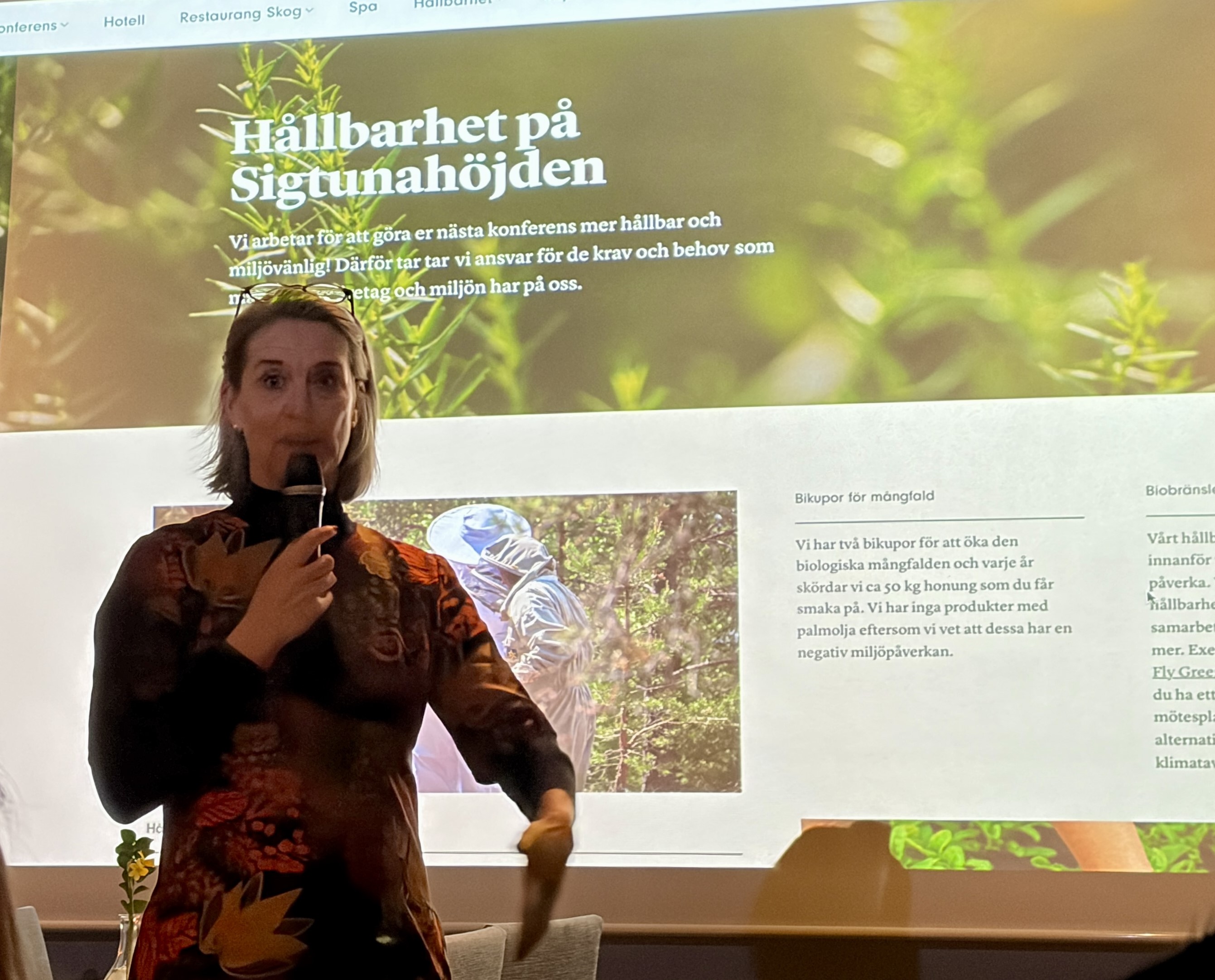 Därefter berättade VD Lotta Giesenfeld Boman, som äger och driver Sigtunahöjden, hur de på ett konstruktivt sätt arbetar med hållbarhet. Hon visade även prov på kläder till personalen som är uppsydda av återvunna tyger.