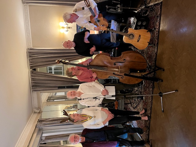 Vår President Lisbeth , dagen till ära blivit "julkul"tackar den eminenta orkestern Grus Grus för en mycket medryckande musikunderhållning.