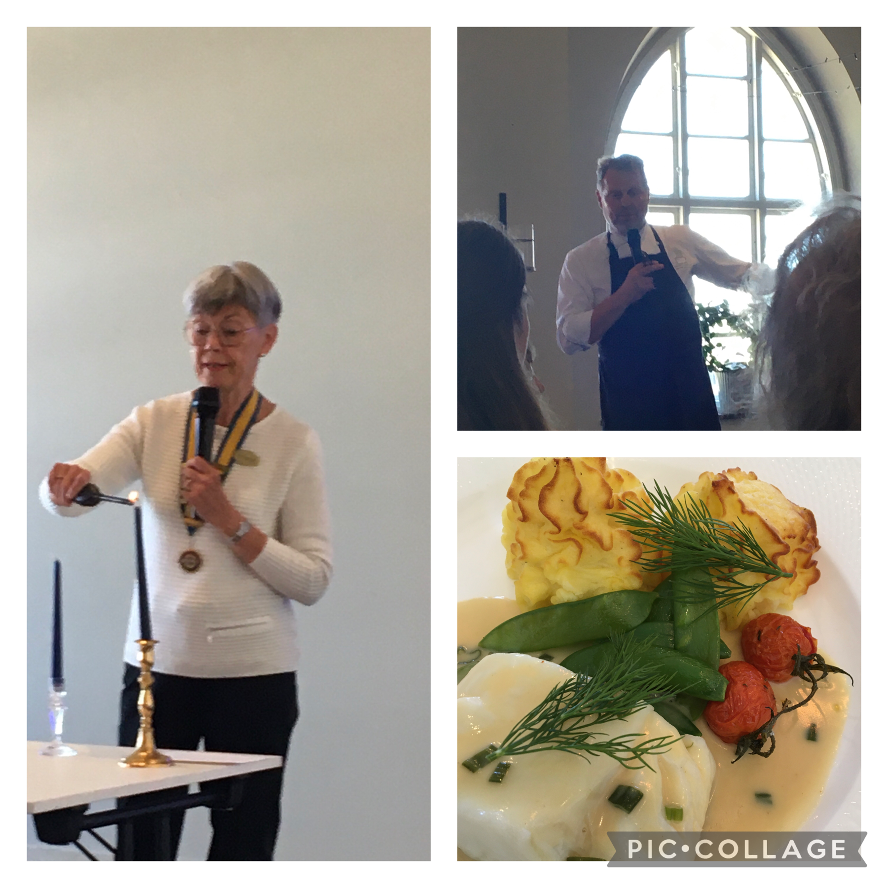 Göteborg Södra IW Clubs president öppnar mötet. Krögaren berättar om området Kviberg där vi har vårt möte och presenterar maten.