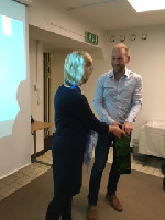 Månadsmötet den 16 november hade vi besök av Ögonspecialisten Johan Ursberg. Bl a talade Johan om olikheterna av grå och grön starr. Vi som lyssnade satt mycket tysta och intog intressant kunskap. Vid sista bilden tackar vår president Karin Ursberg sin son Johan för en givande och intressant föreläsning. Foto: Elisabeth Sjöström